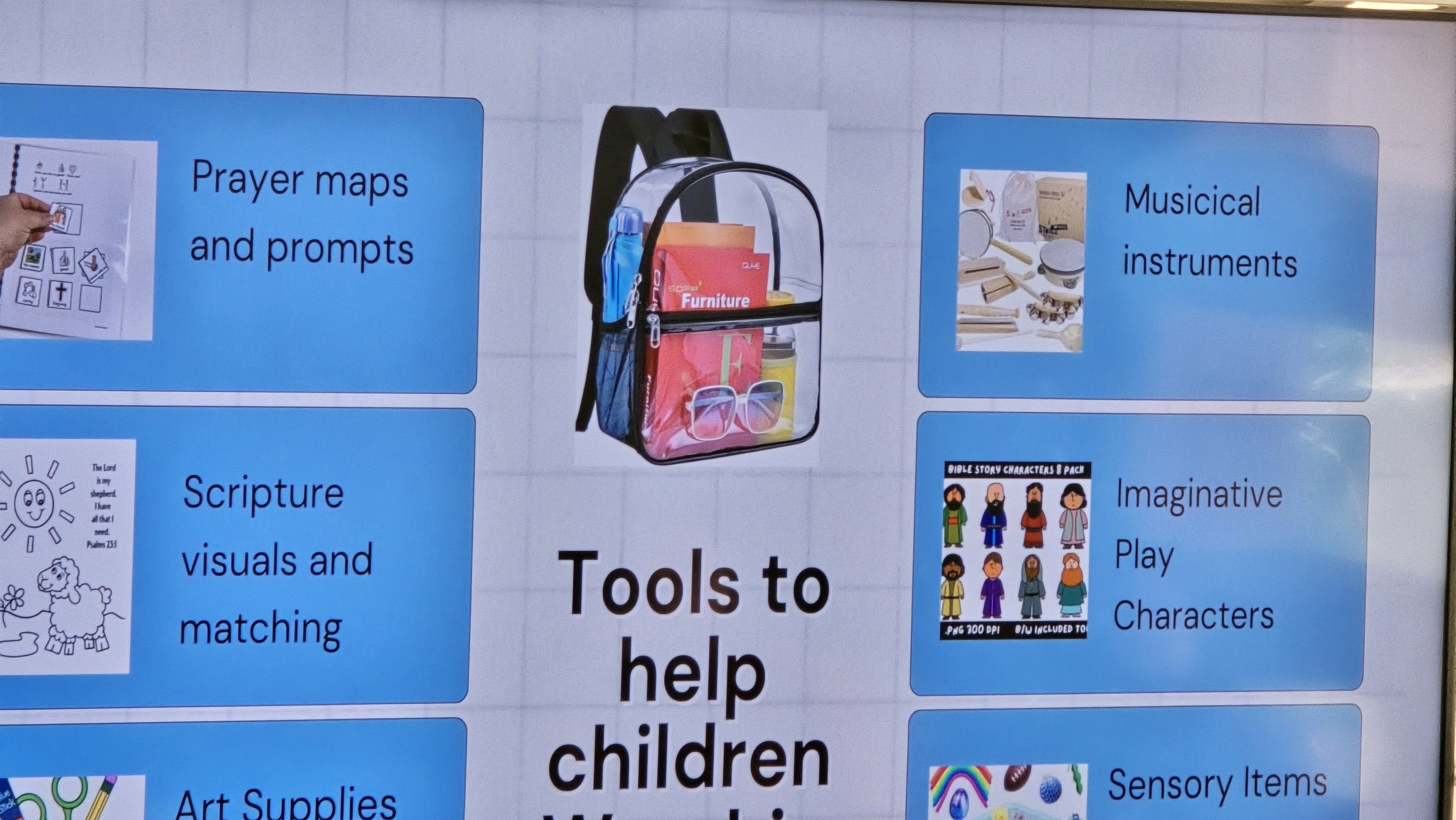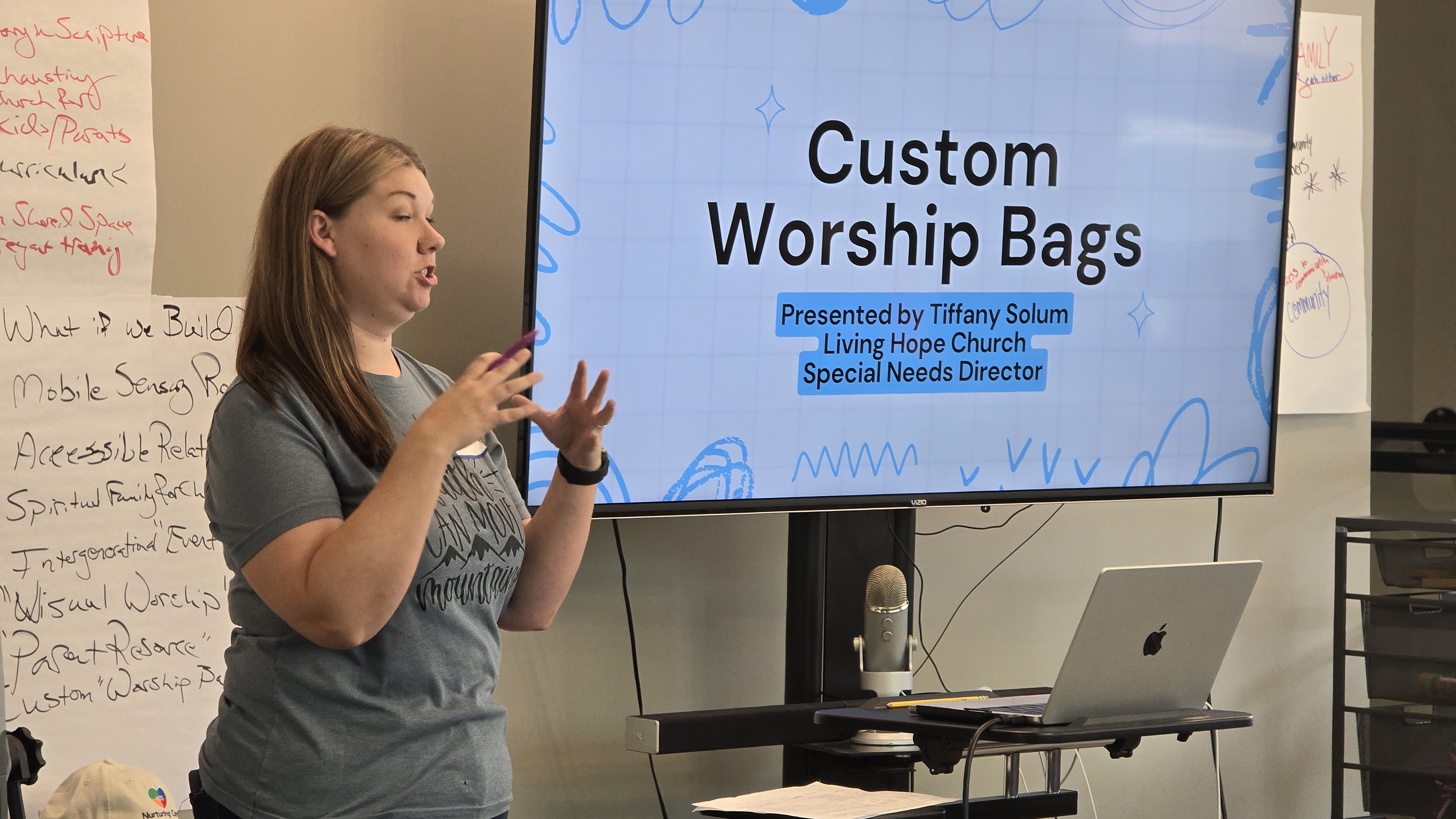 In addition participants in other prototypes updated their efforts. Tessa reported that her colleagues who work more exclusively with typically-abled kids have recently reached out to her for advice on how to retool their kids worship to be more inclusive of differently-abled children in their congregations. She is currently doing a book study with them and dialoguing about best paths forward for creating an all-abilities worship experience for the Grace Church kids. Also, Tessa is currently trying to train all the children’s ministers across Grace’s 3 campuses to be able to use the worship cart that is primarily kept in the sensory rooms on each campus and used mostly by special needs children.