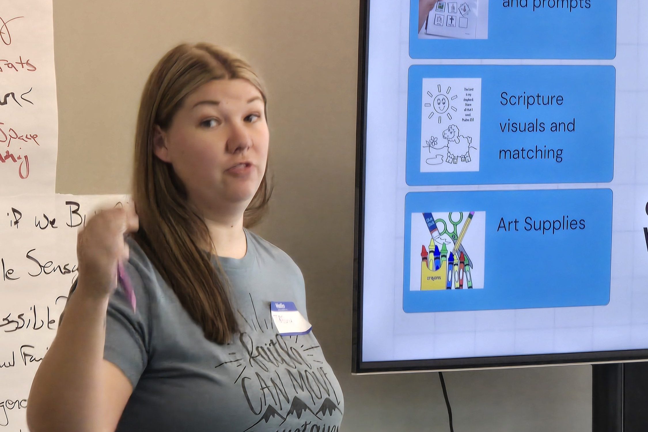 New Hope Church leader Tiffany Solum celebrated that their sensory backpacks now have a rack from which to hang in the church foyer. Tiffany is known on the Kansas City District of the Church of the Nazarene as a resource person, providing workshops and creative resources on disability ministry at district events. She has used her relationships to meet with other churches and share what Nurturing Care provides.